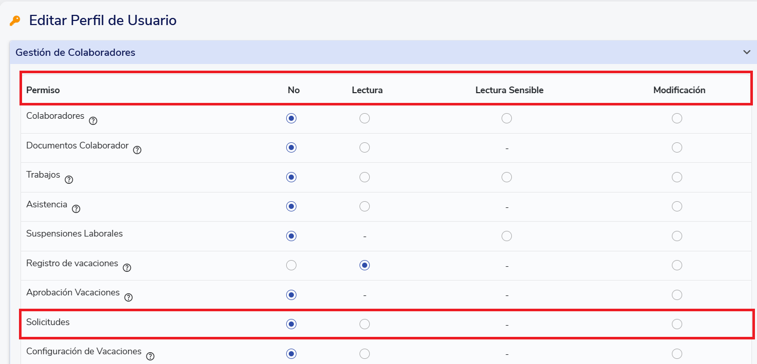 To configure templates, your profile must have the"Modification"permission in Requests. You can check it fromAdministration(⚙️) in the"Usuarios y perfiles"section.