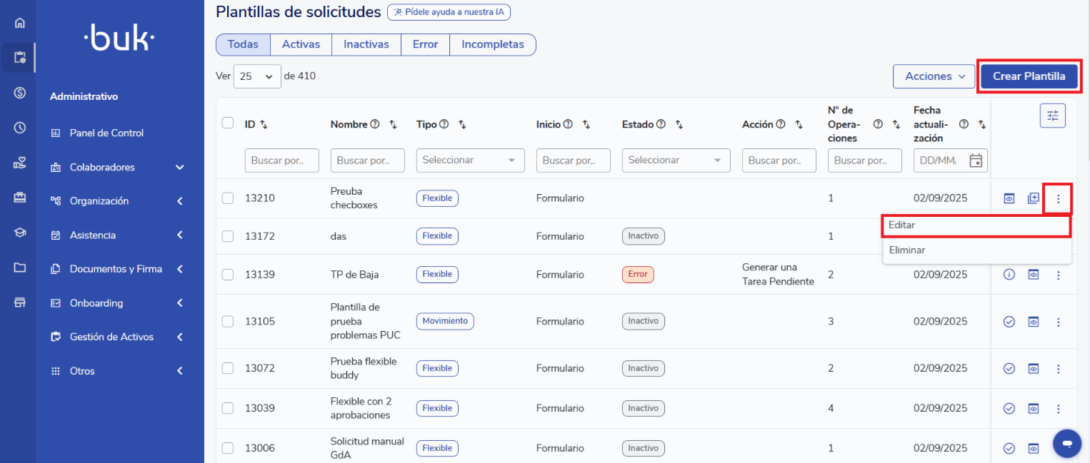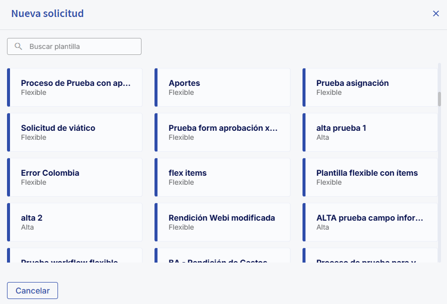 Configurationbutton. Your profile must have "Modification" permission in Solicitudes.Select or create a templateWithin the configurations, select the template (existing or new) you want to configure.