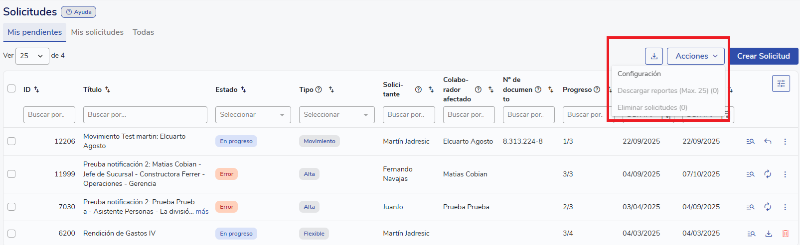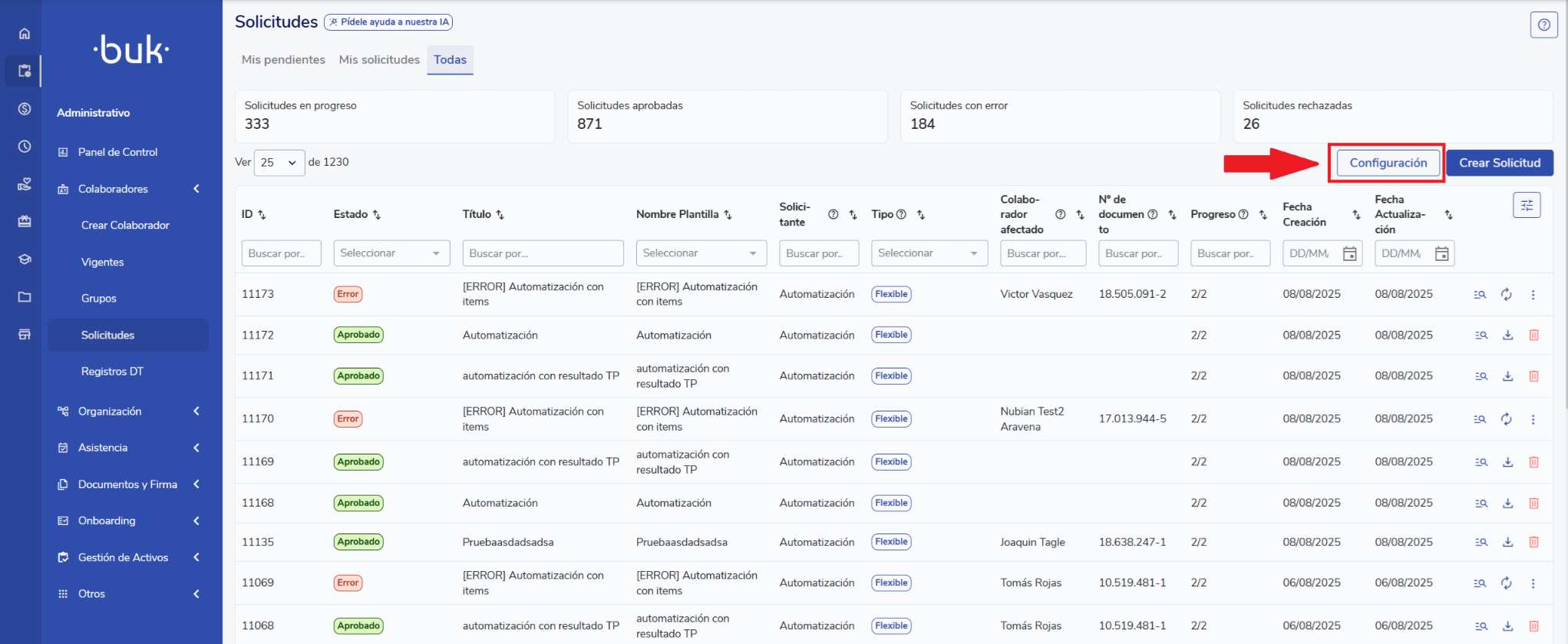 - Go to Administrative > Colaboradores > Solicitudes > Configuration.