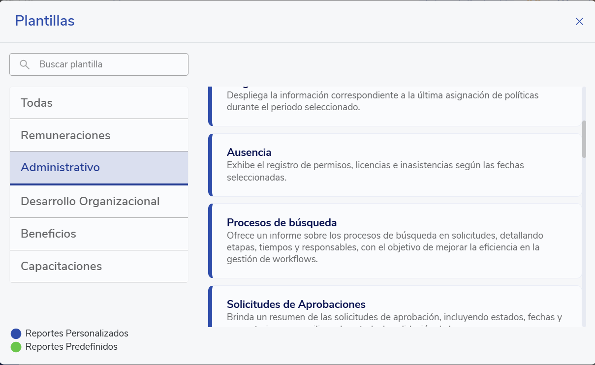 You will see the template modal with all the options available on the platform. In the Administrative section, you will find the Absences option.