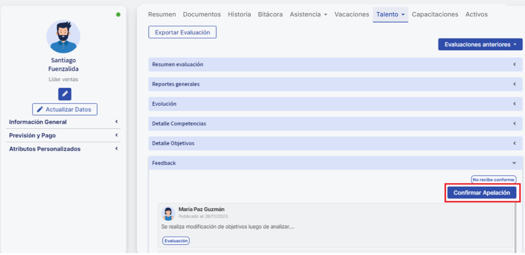 In a performance evaluation process it is possible to configure different stages to be included in it. This way the system provides the flexibility to incorporate stages tailored to your process. Among the configurations we find the Feedback stage, which is aimed at delivering feedback from the downward evaluator to their evaluatees. In this instance, it is possible to incorporate a new flow where the employee being evaluated can request an appeal of their score if they are not satisfied with the result, and therefore with the feedback from their evaluation. This article details the step-by-step flow.