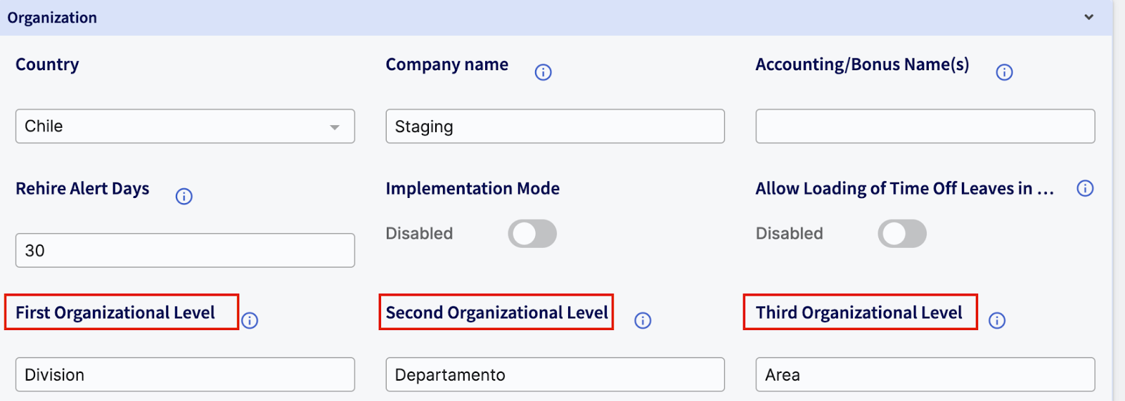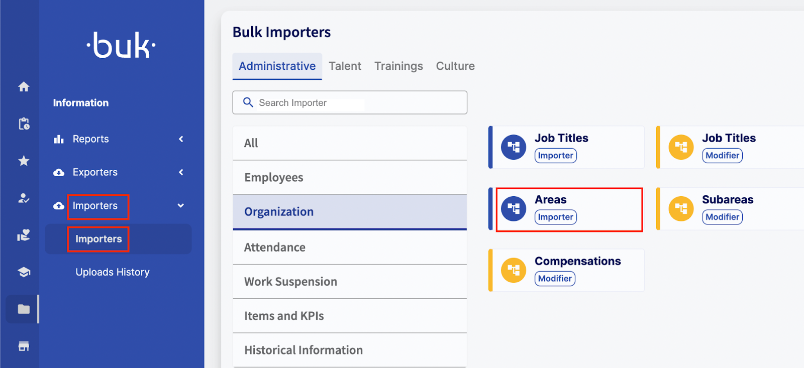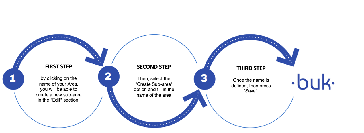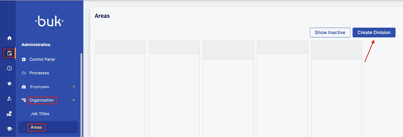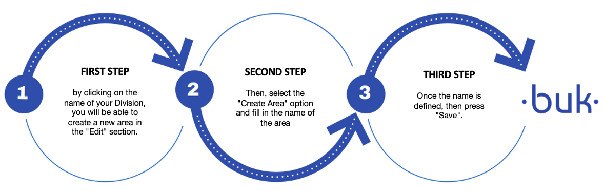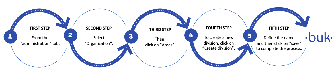 Buk adheres to labor regulations established by the competent authorities, ensuring compliance with legal requirements and offering a secure and automated approach to people management. Before beginning, it is crucial to understand that area information is fundamental for forming the organization's structure. The basic structure is managed by three levels of division: Division, Areas, and Sub-areas. Within a Division are the company's Areas, which are further composed of Sub-areas. It is important to always include at least three levels, and if you do not work with Sub-areas, you can repeat the name of the Area.