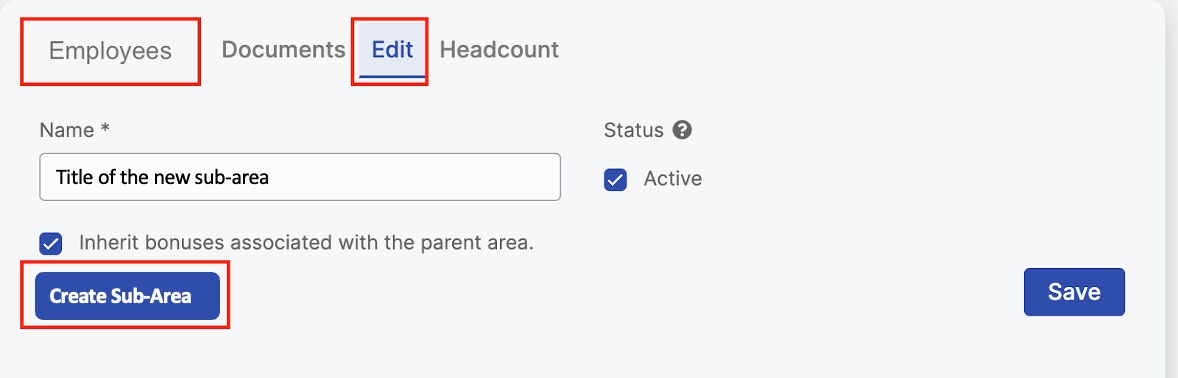 After completing the previous step, you need to create the sub-areas. To do this, click on the name of your Area and, in the "Edit" section, select the "Create Sub-area" option and, fill in the required information. Once ready, remember to save the changes.