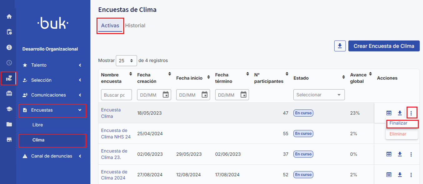 We recommend monitoring the survey and, once the overall progress percentage is representative and the subareas and groups meet the display criteria, proceed to finalize the survey. To do so, in the side menu go to "Clima", select the "Active" tab, find the survey you want to close and, in the "Actions" column, click "Finalize".