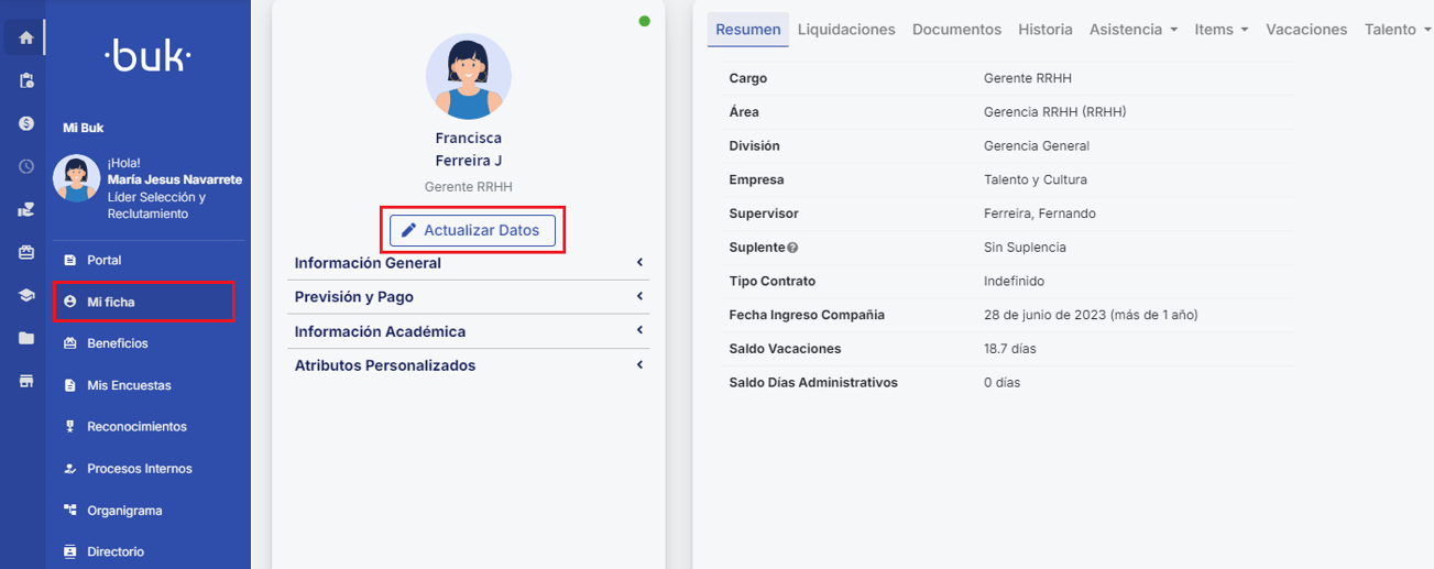 On the portal you will have shortcuts to Buk's main features, which makes it easier to access the tools you use most. From here you can easily navigate to modules such as payroll, benefits, or any other that the company considers relevant.