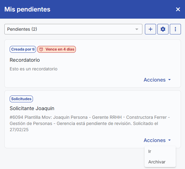 ThePending Tasksallow you to centralize all action items generated within the platform, including the personal tasks created by each user. Within the platform, you can view it as the bell icon located in the top bar. Also, from this same area it is possible to directly manage each task, which simplifies and speeds up administration.