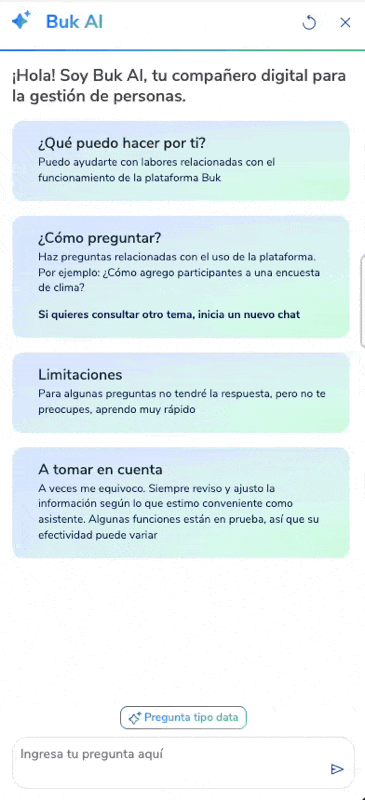 Buk AI is your intelligent assistant within Buk. It is designed to help you quickly resolve questions, whether about human resources, using the platform, or help articles. You can interact with it from the chat located in the bottom right corner of the platform.