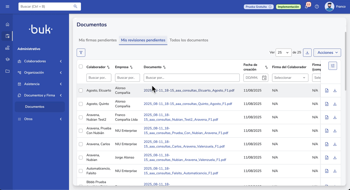 From the home page of your Buk platform, go to the main menu located on the left side of the screen. Within the"Administrative"menu and in the"Documents and Signature"module, select the"Documents"section. Once in the documents inbox, select the"My Pending Reviews"