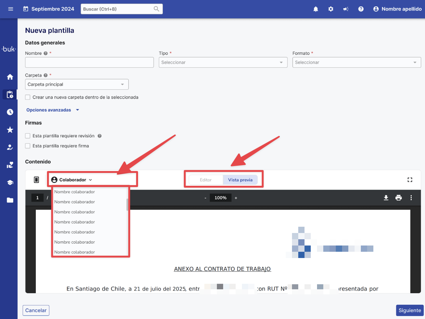 To generate the document, the next step is to choose an employee from the list that will be displayed in the"Colaborador"menu. Buk will use the information of the person you select to fill in the template variables.