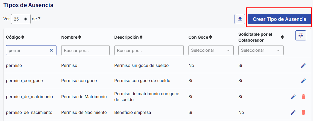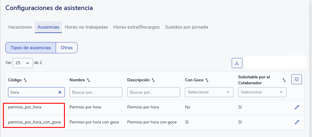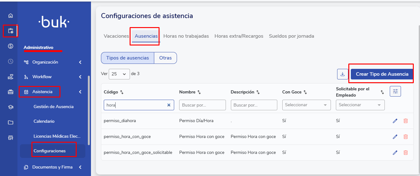To be able to create “Tipo de Ausencias” you must have contracted BUK in its plataforma PRO version; otherwise you will only be able to use the default hourly permissions (Permiso por hora and Permiso por hora con goce de sueldo).