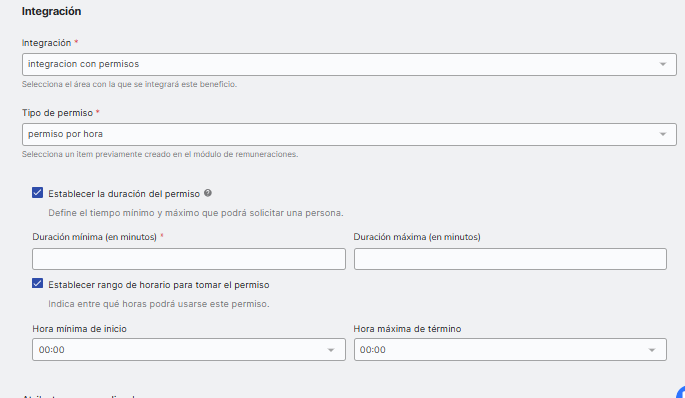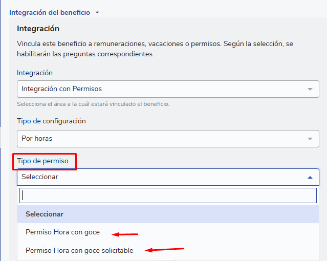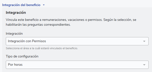 How to create a benefit. Upon reaching the option“Integración”you will find 3 options; you should select“Integración con Permisos>>Permisos por hora”: