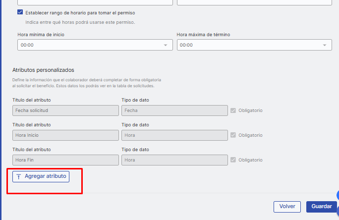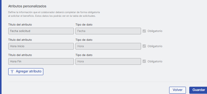 Once all the previous steps are configured you will find the “Añadir Atributo” section in which there are 3 fields locked for editing that cannot be modified as they are vital for the collaborator's request: