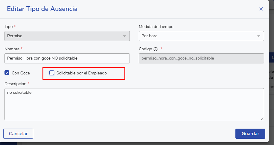For a new Tipo de Ausencia to only appear in the "Integración con permiso desde Beneficios" configuration andnotin the "Asistencia" tab of the collaborator's profile, you must not select the "Solicitable por el colaborador" option. By deactivating this option, the new permission will only be available when creating an integrated benefit with a permission and not in the Asistencia section for the collaborator.