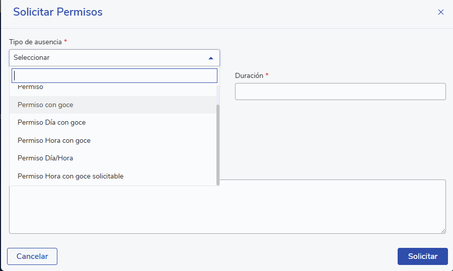 Subsequently, you must select the“Tipo de permiso”, the options previously established in the “Tipos de Ausencia” section will be displayed. Remember that the essential plan will only show two options: “Permiso” which is the unpaid option and “Permiso con goce”. Clients who have contracted the pro plan will have the ability to view and select the other types of absence created in the previous point: