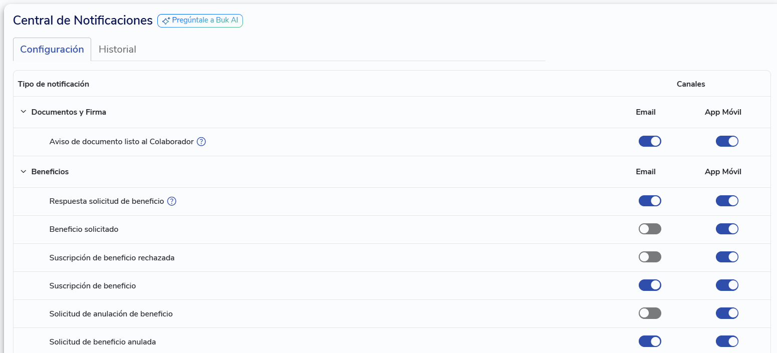 In Buk, you can customize how you receive notifications by choosing your preferred channels for each type of alert. Currently, the available channels areemail,Mobile AppandSMS. Soon, new options such as Google Chat, Slack, and Teams will be added.