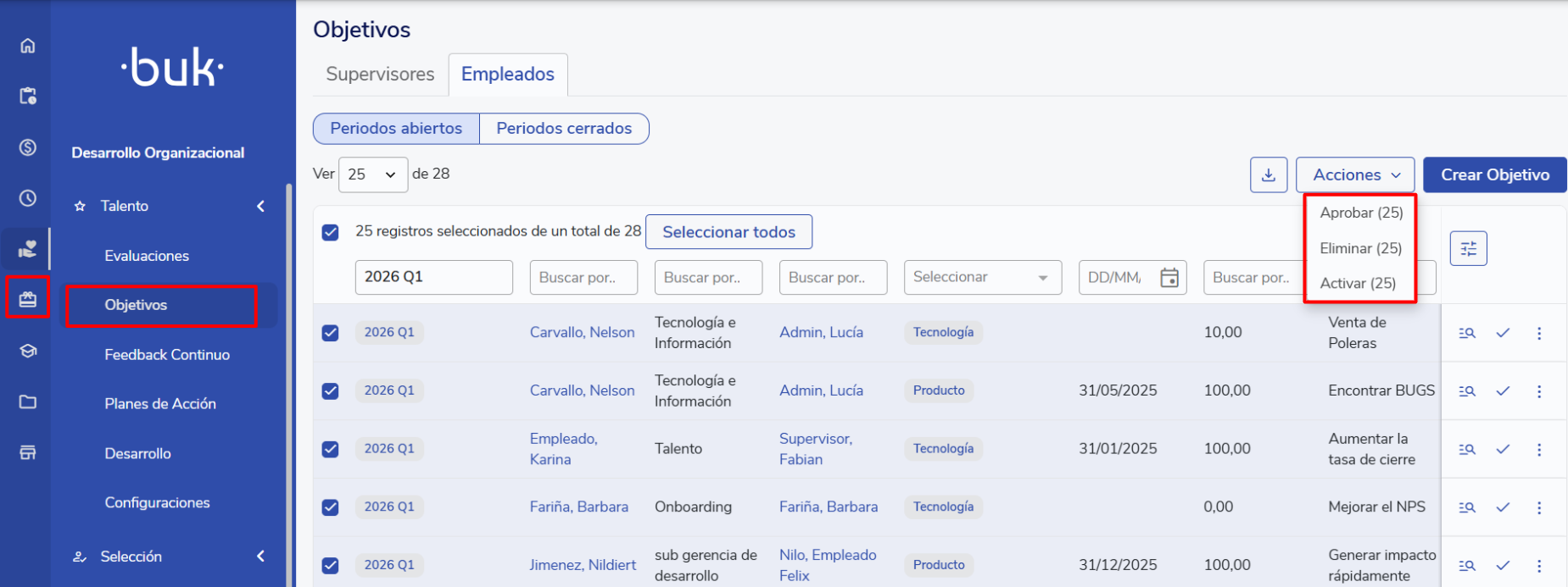 You can approve and activate multiple employees' goals at the same time from the Goals section or by using Buk's bulk import and modify tools. The importer is used to upload new goals and the modifier to update existing goals.