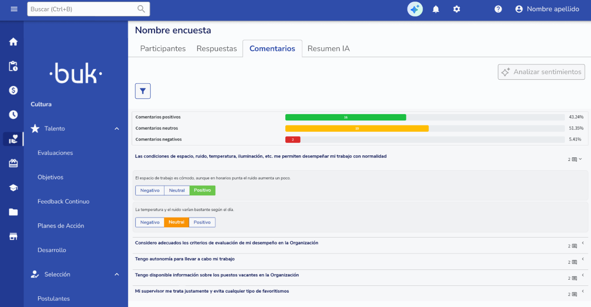 Now you can enhance the analysis of yourOpen Surveysusing Artificial Intelligence. This feature allows you to automatically interpret your collaborators' open-ended responses, classifying them according to the tone of their message. This way, you can quickly identify whether comments arepositive, neutral, or negative, saving valuable time in managing workplace climate and culture.