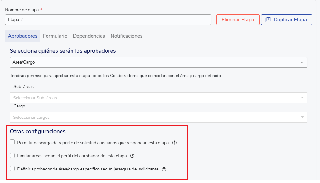Definir aprobador de área/cargo específico, con la finalidad de que la jefatura que pueda aprobar esta etapa corresponda al supervisor del solicitante.