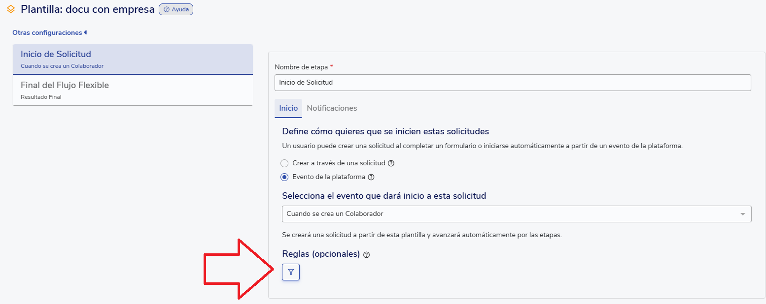3. En la configuración de la plantilla, selecciona inicio por "Evento de la plataforma" y elige el evento que dará inicio a esta solicitud