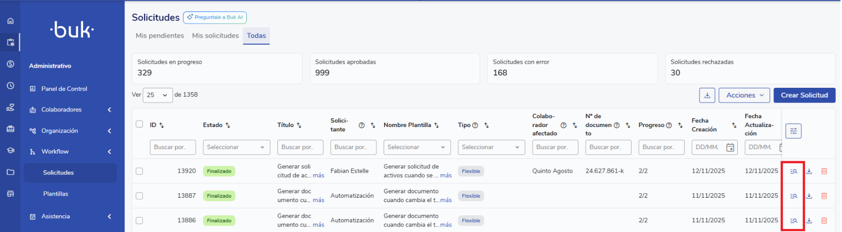 Cada vez que se ejecute una automatización, veras acá una entrada con la ejecución. Si realizas una acción masiva, como un alta de varios empleados, veras una fila por cada empleado con el estado de cada una.