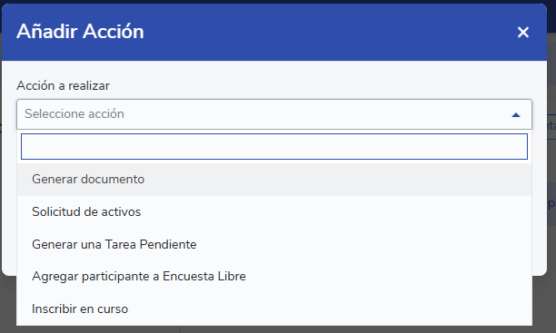 Por otro lado, una acción es lo que se ejecuta automáticamente cuando ocurre el evento (por ejemplo, generar una tarea pendiente o un documento).