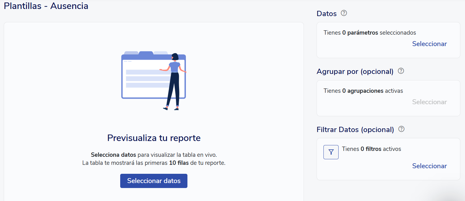 La sección de Parámetros te permitirá escoger los datos que quieres para tu reporte, por ejemplo los tipos de datos personales de cada colaborador y las columnas de datos de ausencias o del trabajo que necesites.