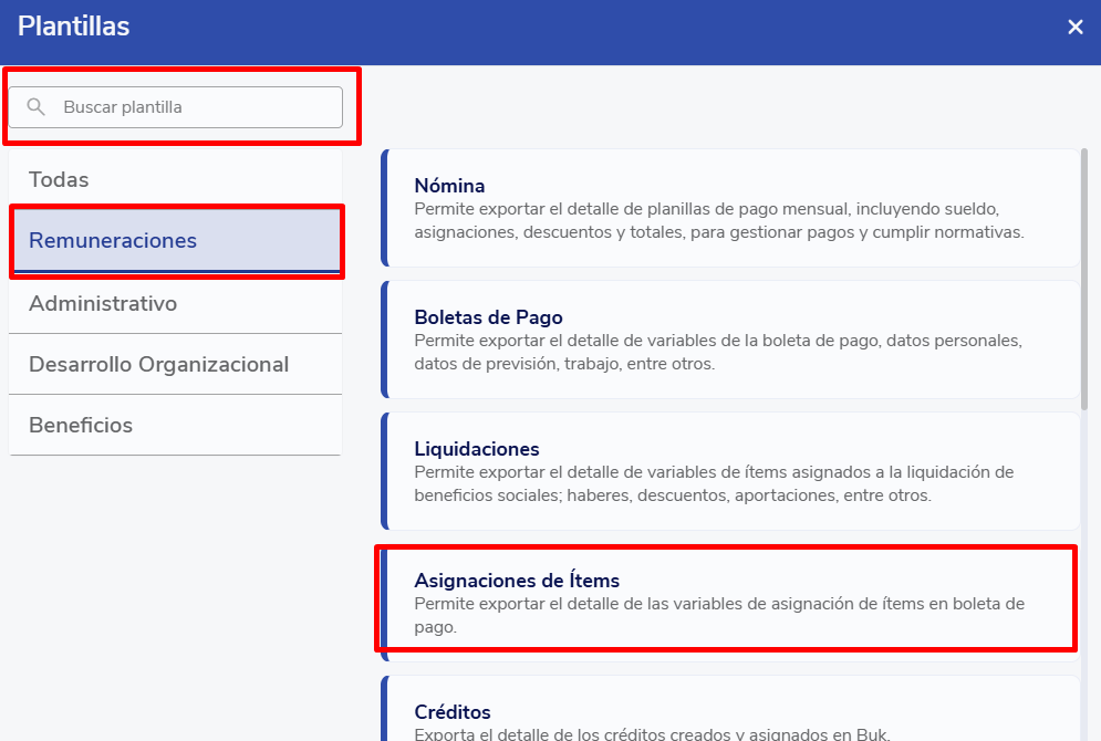 Luego de ello, debes elegir la plantilla de asignaciones de items que se encuentra dentro de remuneraciones, también puedes usar el buscador para que sea mas fácil encontrarlo.