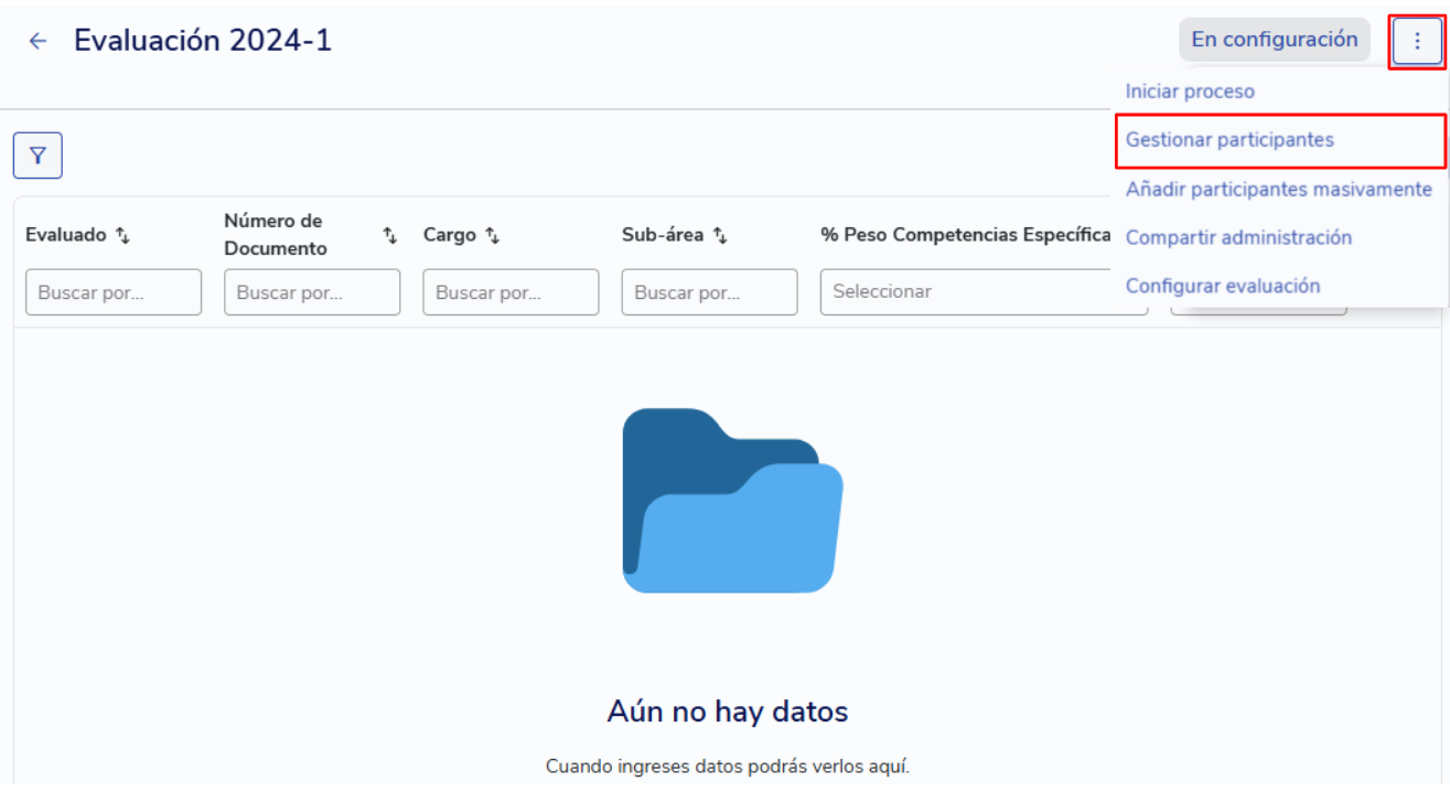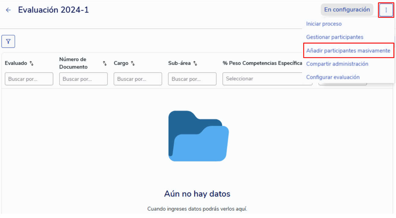 [IMPORTANTE] Esta opción no estará disponible si en la configuración de la evaluación seleccionaste “Habilitar múltiples evaluaciones”. En ese caso, deberás utilizar la opción masiva “Añadir participantes masivamente”.