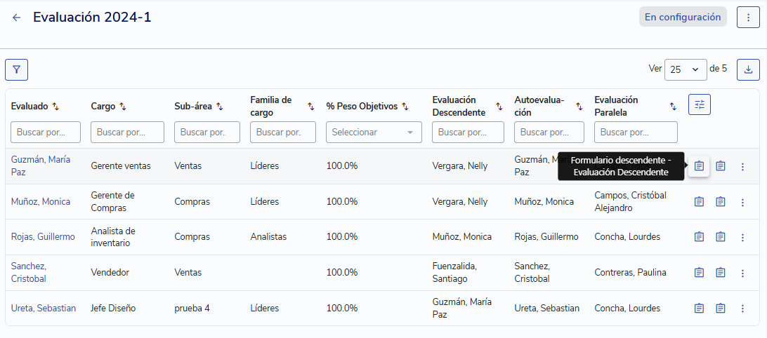 Podrás revisar el listado de evaluados con sus respectivos evaluadores en la tabla. En la última columna, puedes revisar los formularios que deberán contestar los evaluadores de los participantes. También podrás verificar si los participantes tienen asignados los pesos de competencias y objetivos correctamente (es decir, que sumen 100%). En caso contrario, no podrás comenzar la evaluación.