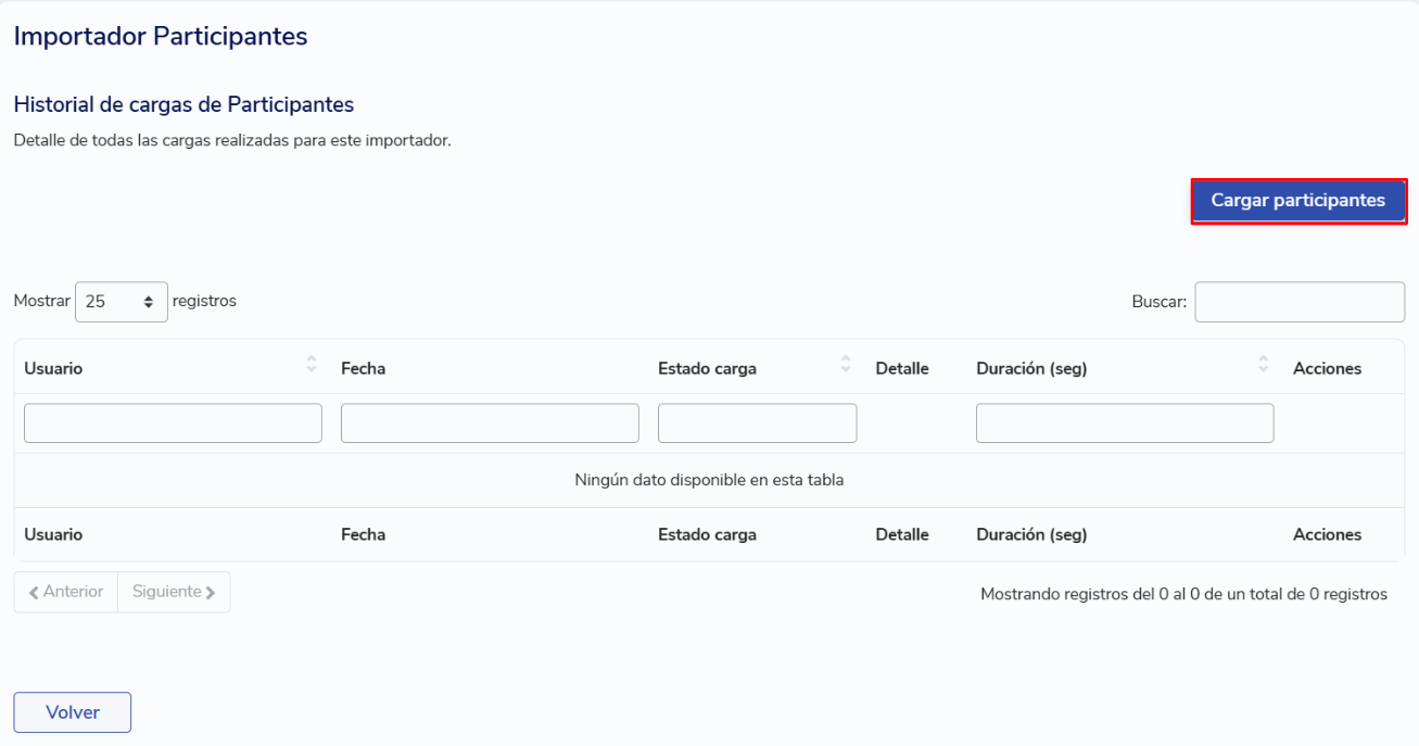 Esto te llevará a la vista de importador masivo de participantes, donde podrás ver todas las cargas que se han realizado y su estado (correspondientes a todas las evaluaciones, no solo a la que estás revisando). También, puedes consultar el registro de las cargas en Reportería > Importadores > Historial de cargas.