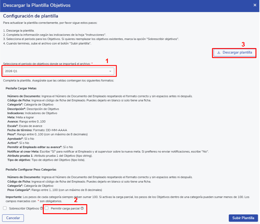 Además, puedes marcar ambas opciones a la vez "Permitir carga parcial" y "Sobrescribir objetivos". En este caso, solo se reemplazarán los objetivos de los colaboradores incluidos en la plantilla, sin afectar los otros objetivos, y no se validará que los pesos sumen 100%.