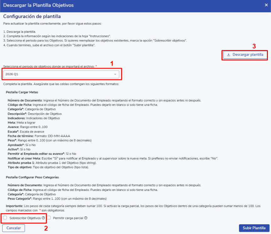 Si necesitas reemplazar los objetivos ya existentes en un periodo por nuevos objetivos, primero selecciona el periodo que deseas actualizar y luego marca la opción “Sobrescribir objetivos”. A continuación, descarga la plantilla, edítala eliminando, modificando o agregando los objetivos que necesites y guarda los cambios. En la plantilla descargada aparecerán todos los objetivos que ya se encuentran cargados en la plataforma para cada colaborador.