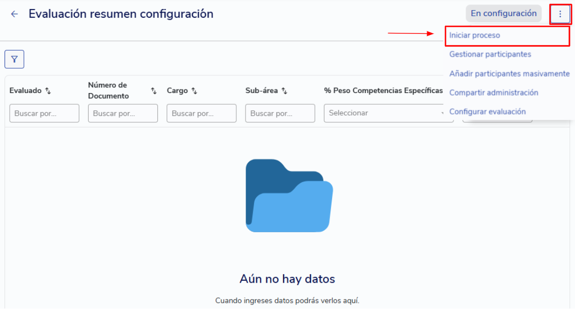 Una vez dentro, en el botón de acciones (tres puntitos) encontrarás el botón "Iniciar proceso"; al hacer clic en él, serás dirigido automáticamente al resumen de configuración.