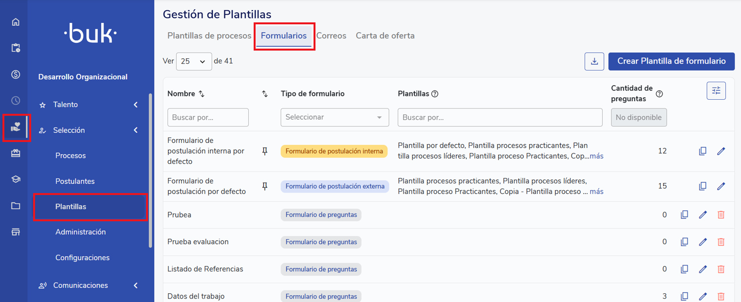 Para crear plantillas de formularios para postulación externa, ingresa a "Selección" en el menú lateral y selecciona "Plantillas". Luego, en la pestaña "Formularios", haz clic en "Crear formulario"