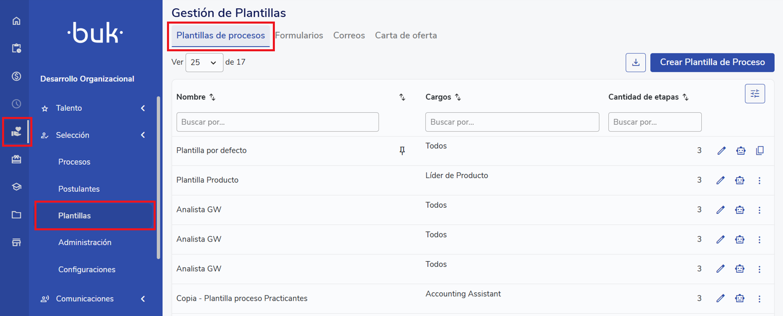 Las plantillas de procesos de selección permiten definir previamente las etapas que serán parte de un proceso de selección. Estas plantillas pueden ser configuradas desde Selección > Plantillas. En la sección Plantillas de procesos podrás crear y editar plantillas. Para configurar sus etapas y cargos a los que están asociados, debes crear una nueva o editar una ya existente. Puedes crear nuevas plantillas desde "Crear Plantilla de Proceso".