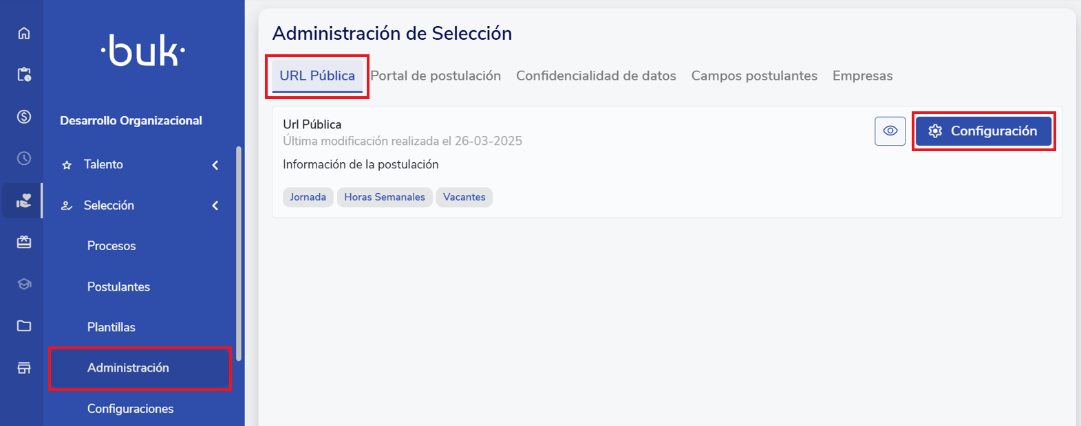 Para configurar la URL pública de los procesos de selección en Buk, dirígete al menú lateral y selecciona "Selección". Luego, accede a la opción "Administración" y haz clic en "Configuración URL pública". A continuación, elige "Configuración".