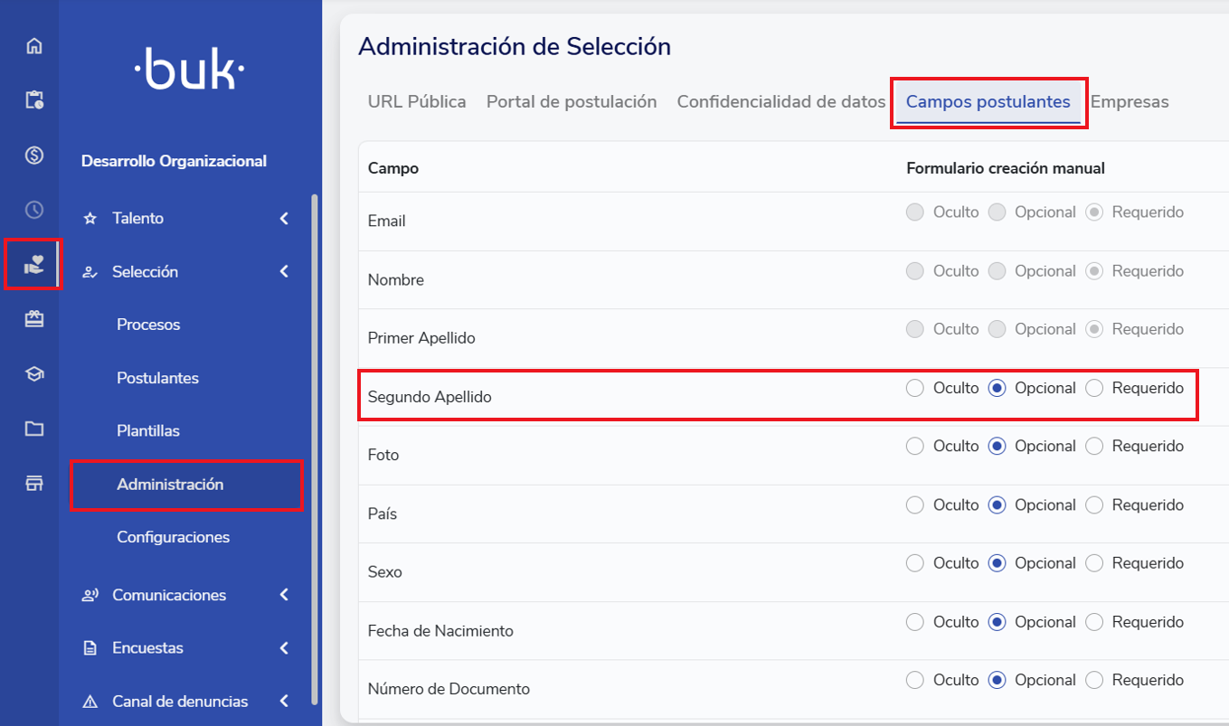 Una vez creado el nuevo campo a través de los atributos personalizados, debes ir al módulo de Selección para configurarlo. Para esto entra a "Selección", luego a "Administración" y acá en la pestaña "Campos Postulantes" están los atributos.