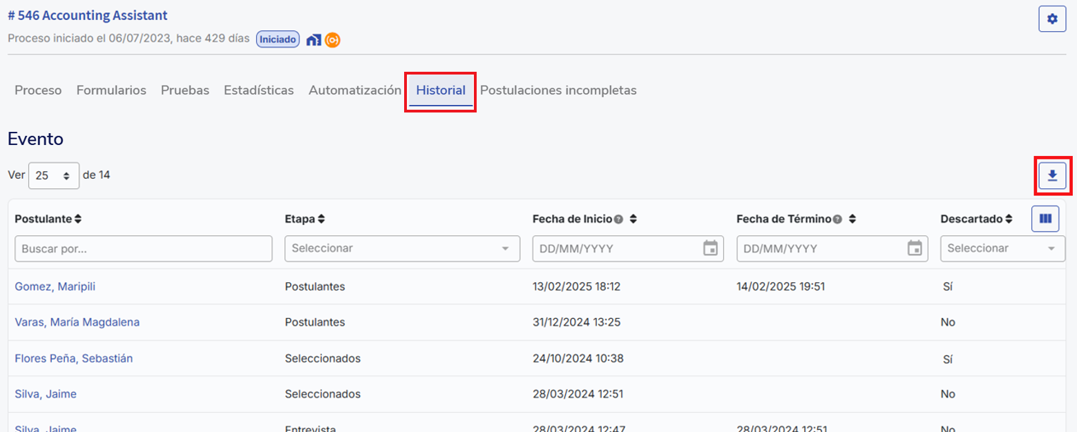 Esta sección muestra el historial de movimientos de los postulantes en cada etapa, incluyendo aquellos que han sido descartados.