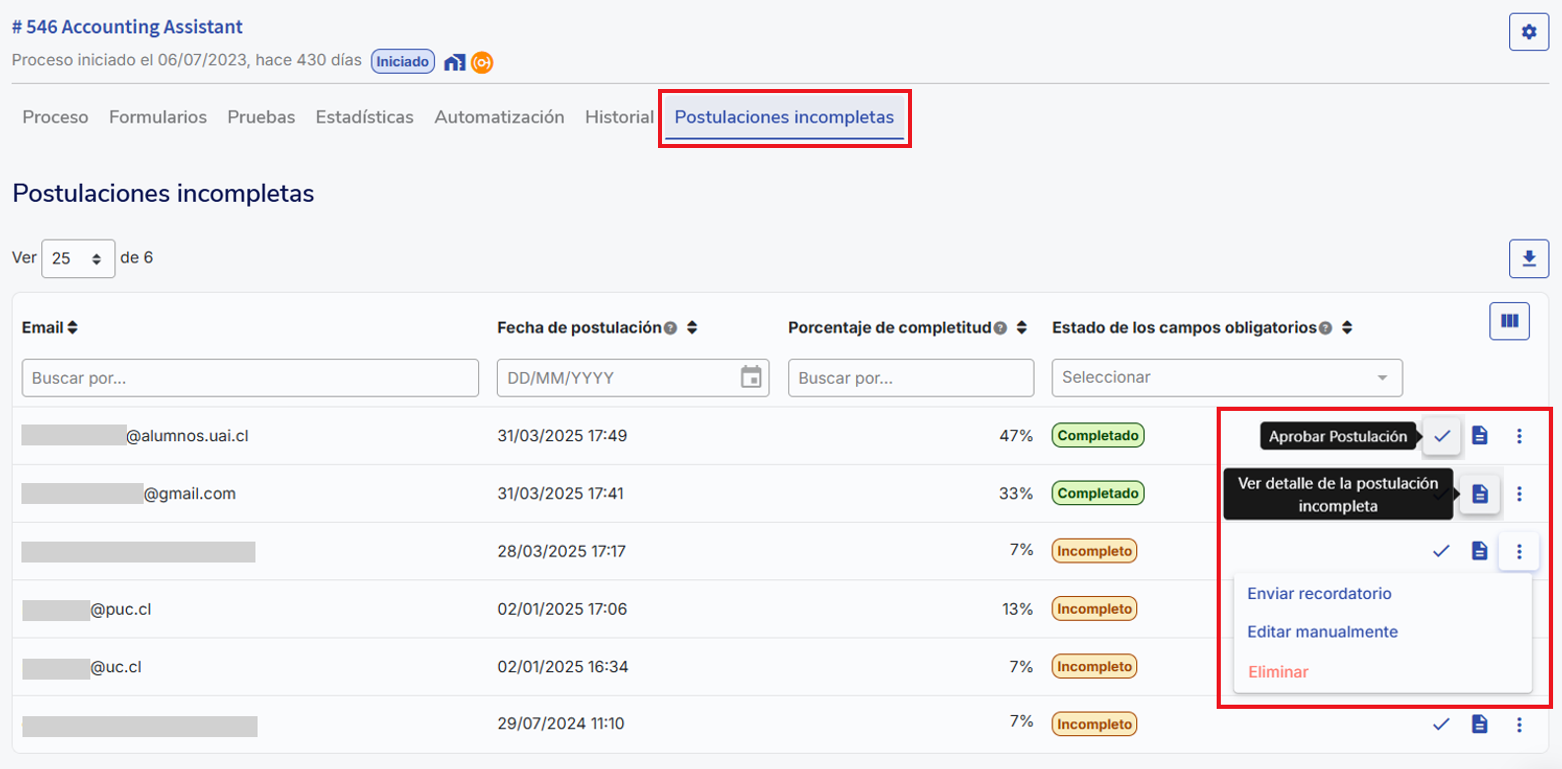 Aquí se encuentran los postulantes que iniciaron el formulario pero no lo enviaron o solo registraron su correo. En la tabla se visualiza el correo del postulante, su porcentaje de avance y si los campos obligatorios están completos o incompletos.