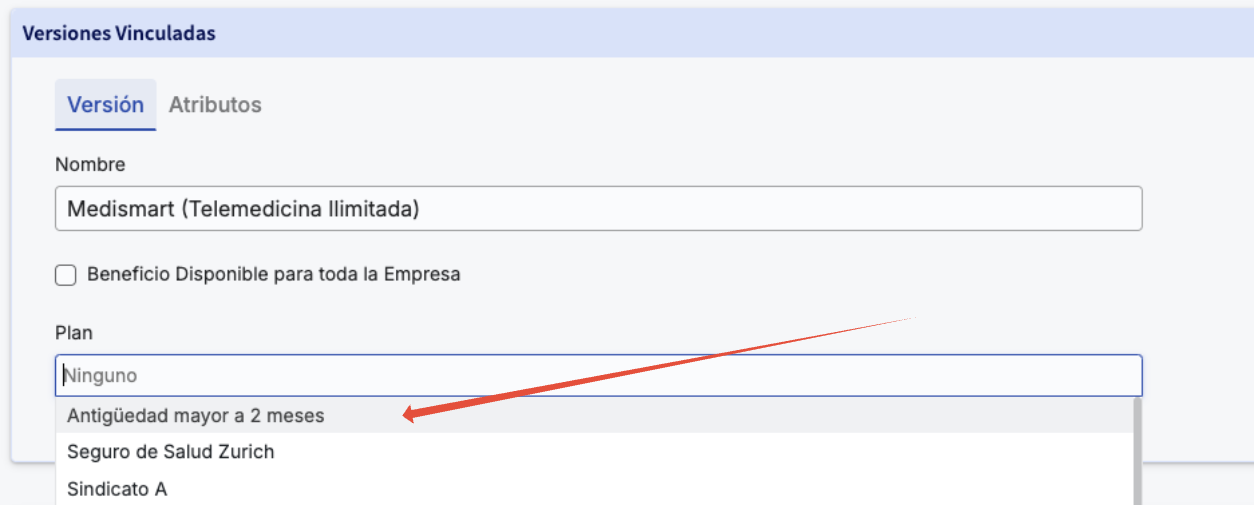En el formulario del beneficio, en versiones, debes primero quitar el check de beneficio disponible para toda la empresa. De esta forma se desplegará el selector con todos los planes existentes. Selecciona uno a varios planes.