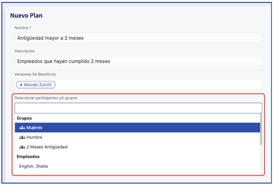 Al seleccionar "Nuevo Plan", introduce el nombre del plan, una descripción opcional y escoge los empleados o grupos beneficiarios desde la opción "Seleccionar participantes y/o grupos". En esta casilla, puedes añadir participantes manualmente o utilizar un grupo basado en condiciones específicas, lo cual permite mantener actualizados los beneficiarios según dichas condiciones. Consulta este enlace para más información sobre "Grupos de empleados basados en condiciones".