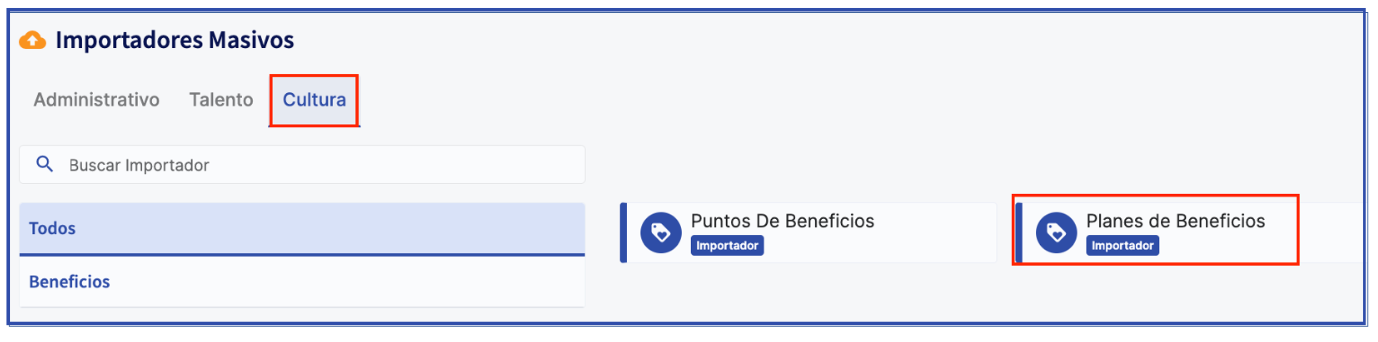 Podrás cargar los planes de beneficios de forma masiva dirigiéndote hasta el módulo de "Información" en "Importadores" y luego haciendo clic en "Importadores", allí, podrás ubicar el importador de "Planes de Beneficios". Añadiendo de esta forma a tus colaboradores los estarías eligiendo de forma permanente y no en base a condiciones automáticas.