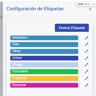 Se desplegará una barra lateral (sidebar) que te permitirá visualizar las etiquetas que vienen predefinidas en tu plataforma las cuales podrás modificar, editar (color, nombre o eliminar) o crear nuevas etiquetas.