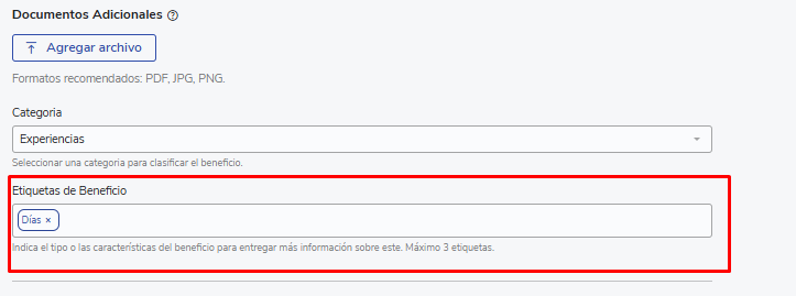 Puedes seleccionar más de una etiqueta. Estas se mostrarán en el card y sidebar del beneficio en la vista de beneficios disponibles.