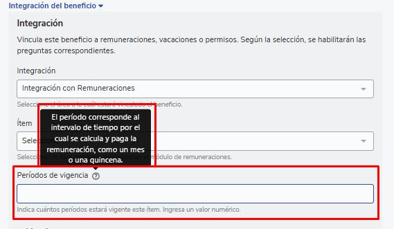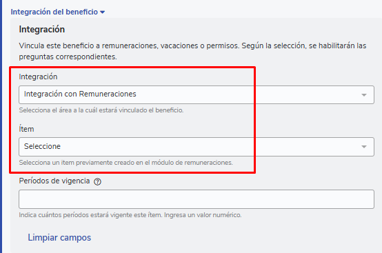 Dentro de la configuración de tu nuevo beneficio encontrarás la opción Integración deberás indicar "Integración con remuneraciones" y seleccionar el haber creado en el paso inicial en la opción Ítem. (recuerda que en Ítem solo mostrará los haberes que fueron configurados con la opción "Permitir asignación vía beneficios").