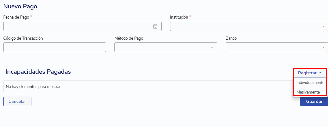 En la sección Incapacidades Pagadas, haz clic en Registrar > Individualmente.