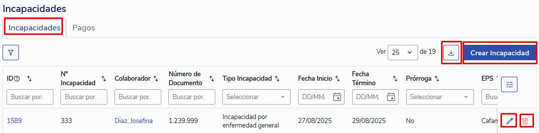 Eliminar: borrar la incapacidad tanto de esta tabla como de la ficha del colaborador.