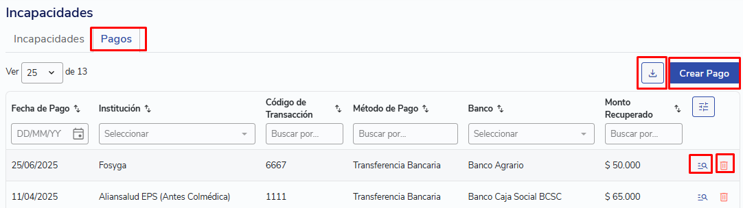 Pagos: Historial de los abonos recibidos por las entidades de salud, donde verás información como la entidad, medio de pago, entre otros. Desde aquí también podrás: