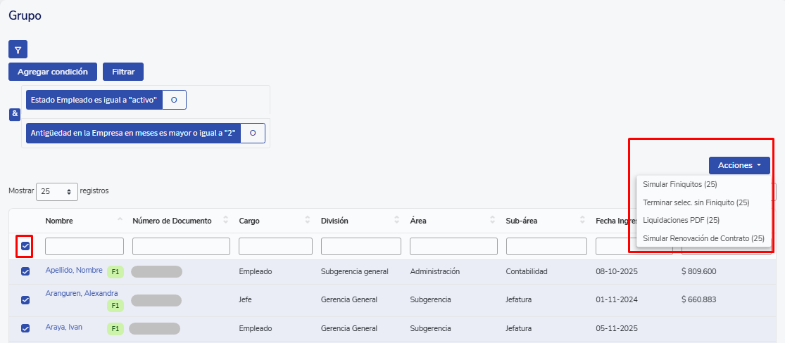 Dentro de cada grupo podrás realizar estas acciones de forma masiva: Simular finiquitos, terminar seleccionados sin finiquito, obtener sus liquidaciones PDF o simular su renovación de contrato.