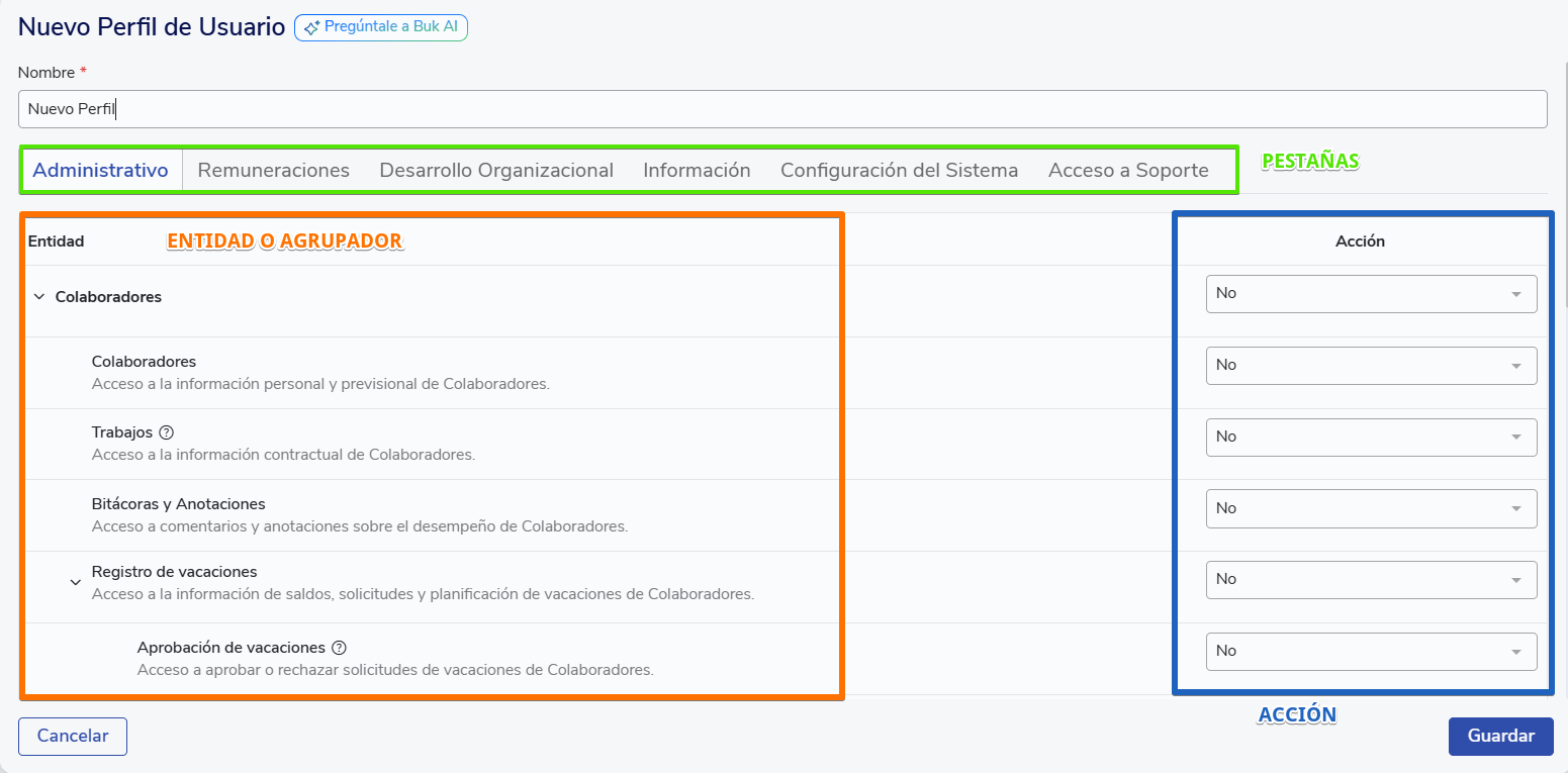 Cuando comienzas a usar Buk, ya cuentas con los siguientes perfiles: